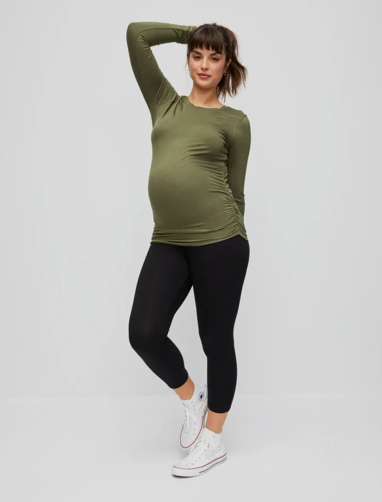 These crop maternity leggings are a welcomed addition to any wardrobe. They're perfect for layering long sweaters and tees, whether you're chilling at home or headed out around town. Our Secret Fit Belly waistband can stretch over your bump or gently fold below for support that lasts through all 40 weeks and beyond.