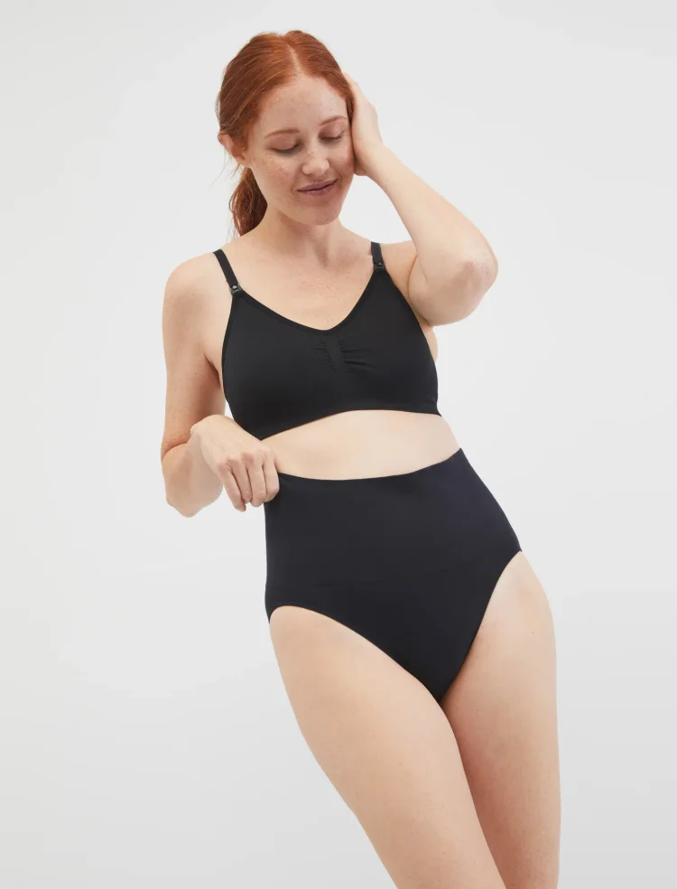 Patent pending post-pregnancy panty features seamless technology with breathable cotton fabric for all day comfort that helps to minimize the appearance of post baby belly.